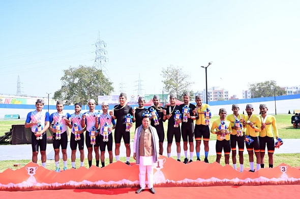 साइकिलिंग विजेताओं को मुख्यमंत्री ने पहनाया मेडल : मुख्यमंत्री पुष्कर सिंह धामी ने 38वें राष्ट्रीय खेल के अंतर्गत रुद्रपुर के स्पोर्ट्स स्टेडियम वेलोड्रोम में साइकिलिंग पदक विजेताओं को मेडल प्रदान कर शुभकामनाएं दी। मुख्यमंत्री ने मनोज सरकार स्पोर्टस स्टेडियम में 38वें राष्ट्रीय खेलों के अन्तर्गत शिवालिक वेलोड्रम मे साइकिलिंग प्रतियोगिता को दर्शक दीर्घा से देखा। उन्होंने वेलोड्रम पहुंचकर खिलाड़ियो से परिचय प्राप्त कर साइकिलिंग भी की। इसके बाद मुख्यमंत्री ने पुरूष वर्ग के टीम परस्यूट डिस्टेंस 4000 मीटर प्रतियोगिता में स्वर्ण पदक विजेता सर्विसेज स्पोर्टस कंट्रोल बोर्ड, रजत पदक विजेता पंजाब व कांस्य पदक विजेता राजस्थान को मैडल व पहाड़ी टोपी पहनाकर सम्मानित किया। इसके उपरान्त मुख्यमंत्री ने खिलाड़ियों के साथ भोजन किया व खिलाड़ियों के लिए की गई व्यवस्थाओं के बारे में खिलाड़ियों से जानकारी ली जिस पर खिलाड़ियो ने सभी प्रकार की व्यवस्थाओं पर प्रसन्नता व्यक्त की।